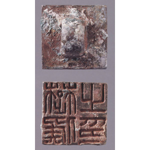 印為鑄造,橋形鈕,印臺近方形,印文為篆書“楚候之印”。“楚候”與“楚司馬”一樣,為楚國軍隊中直接統(tǒng)兵之官,地位較低。《秩律》中記載:“中候、郡候、騎千人、衛(wèi)將軍候、衛(wèi)尉候,秩各六百石。”可知,候與千人秩都為六百石。獅子山楚王墓出土“楚候之印”近百方,表明了楚國當(dāng)時擁有雄厚的軍事力量。