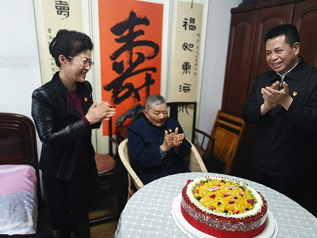 身著中山裝,胸前別著黨徽,錢樹巖被大家圍坐在中間,一字一句地說:“今天的好日子,都是同志們用鮮血和生命換來的,不能忘!我100歲了,與共產黨同齡,雖然老了,但是看到有越來越多的愛國愛黨的年輕人,正沿著我們的來路,把中國建設得越來越強大,我很開心。”