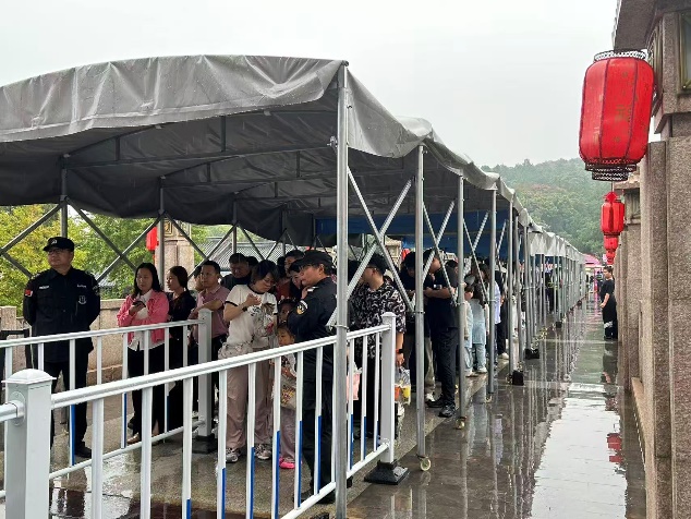 國慶假期期間,徐州正值秋雨綿綿,然而多變的天氣也無法抵擋游客激昂的參觀熱情,游客在館前排起了長龍,文明有序的參觀。