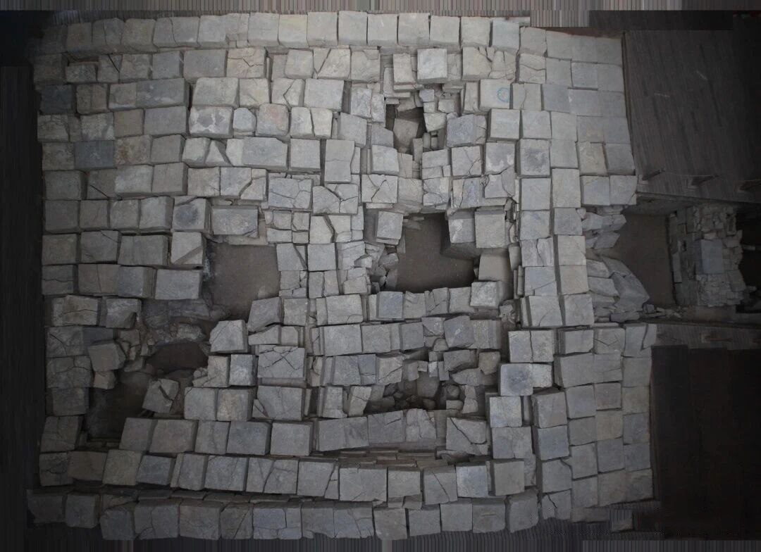 封土之下,還平鋪著四層1100塊封石。2014年起,在建好的保護性建筑之內,考古隊應用工業行車等機械,將封石一一搬離。歷經兩千年封土、封石重壓的墓室被打開時,部分磚體酥粉、墻體開裂。由國內知名學者組成的專家組現場指導,文保人員與考古隊員相互配合,邊搭建保護性支架邊考古,有力保障考古作業的科學推進。