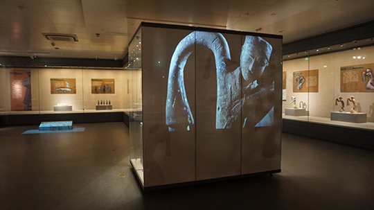 三、展示手段多元化,除了傳統的展板、說明牌及文物展示外,利用多媒體手段,動靜結合,360度展現精品文物特征;充分利用互動區域,挑選不同時代的亮點文物進行講解、臨摹,并挖掘文物背后所反映的政治、生活及時代特征。